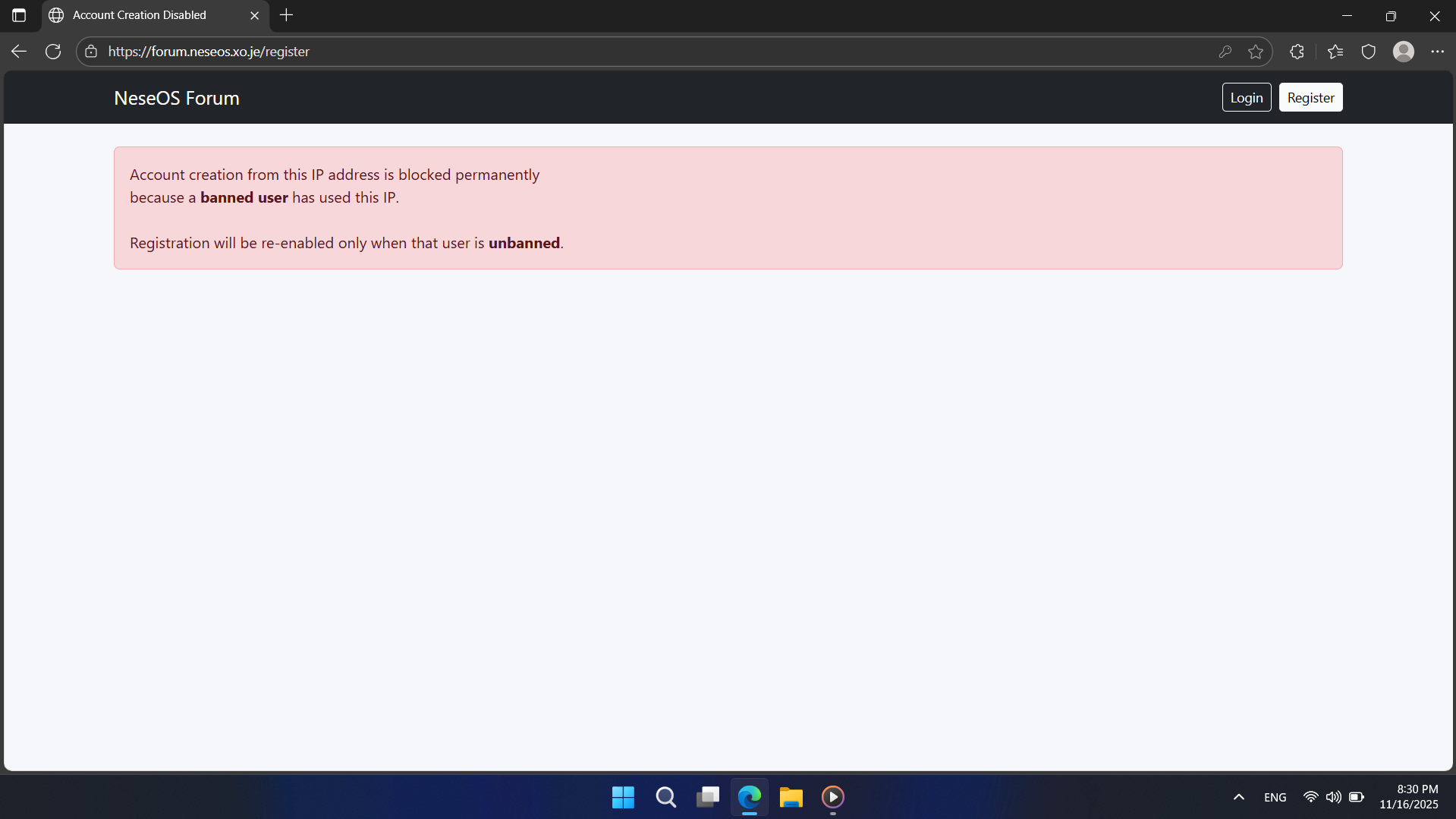 Recently, NeseOS Forum website's "/registry" endpoint was updated. If you're banned (with the same IP), you cannot register the account with the same IP (since you're registering an account on NeseOS Forum website with your IP address). Even if you already registered, associated accounts will also be affected too. Be careful!